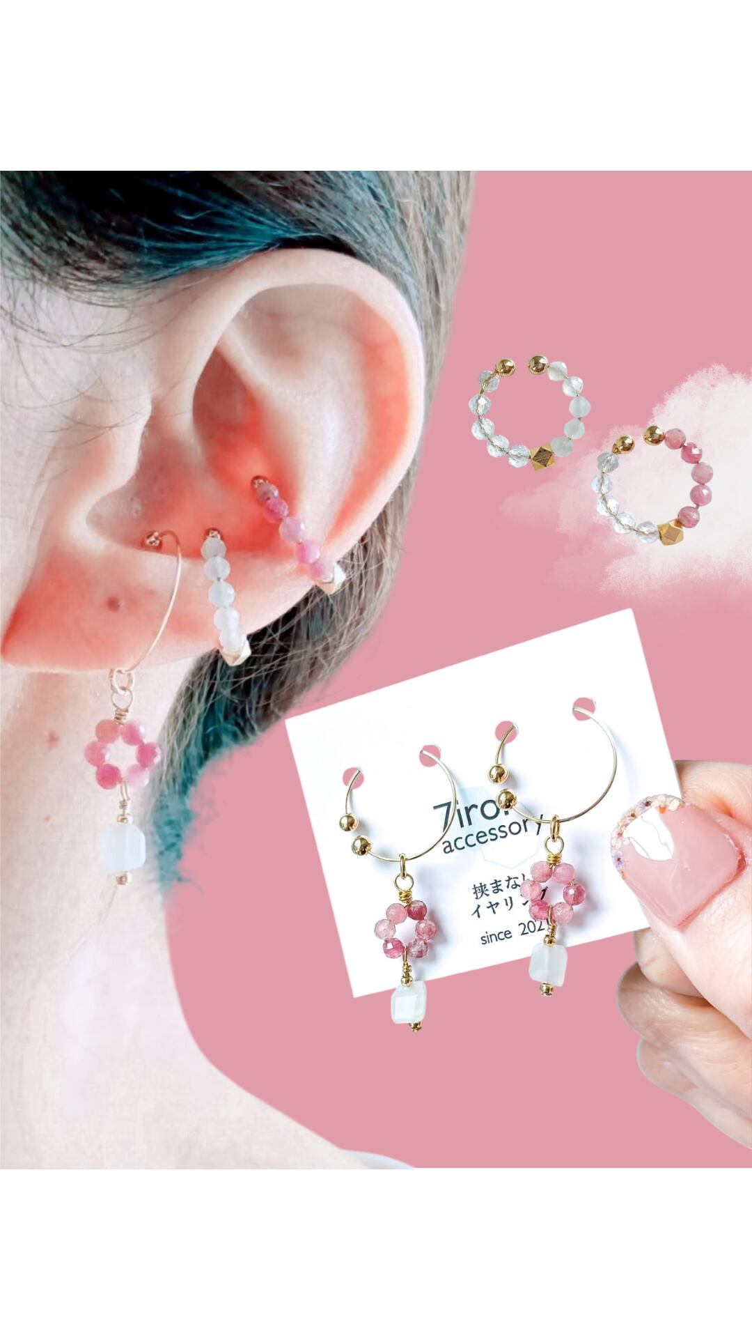 イヤーカフの様に、耳のくぼみに引っ掛けるタイプの金具を使用しております。