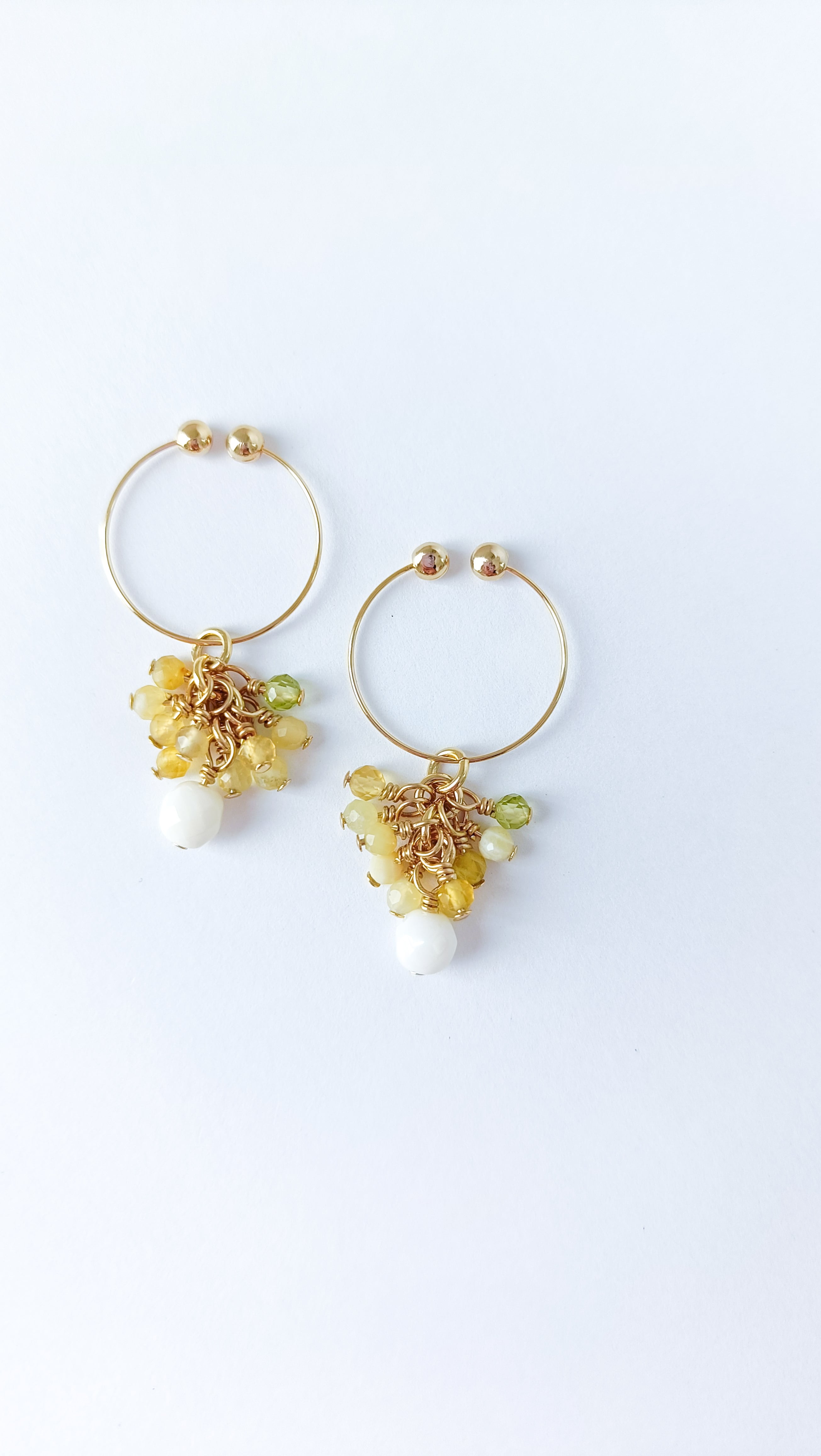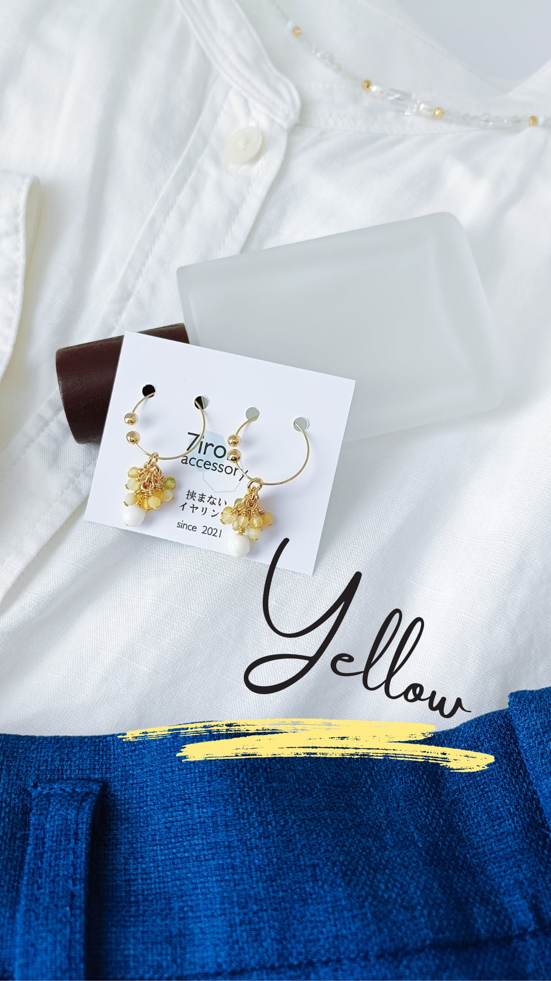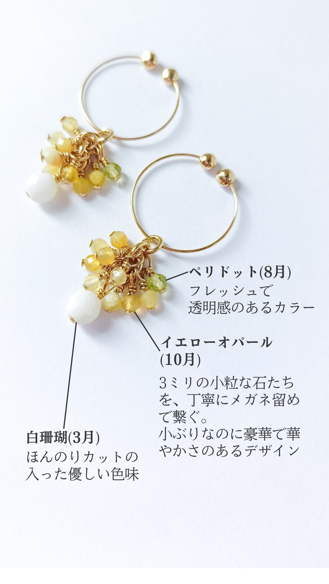 メインは「イエローオパール」という、ニュアンスカラーが魅力の石ですが、アクセントとして「ペリドット」という、フレッシュな透明感あふれる天然石も添えてあります♡
