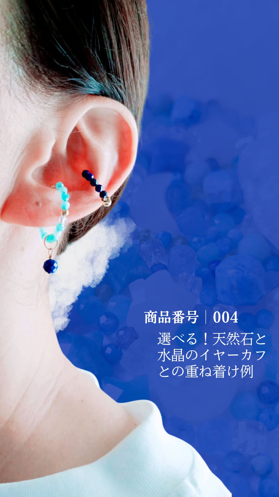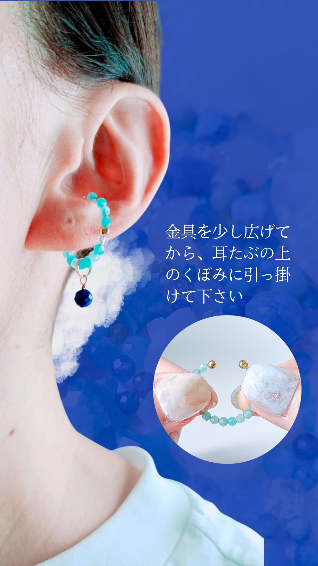 イヤーカフの様に、耳のくぼみに引っ掛けるタイプの金具を使用しております。