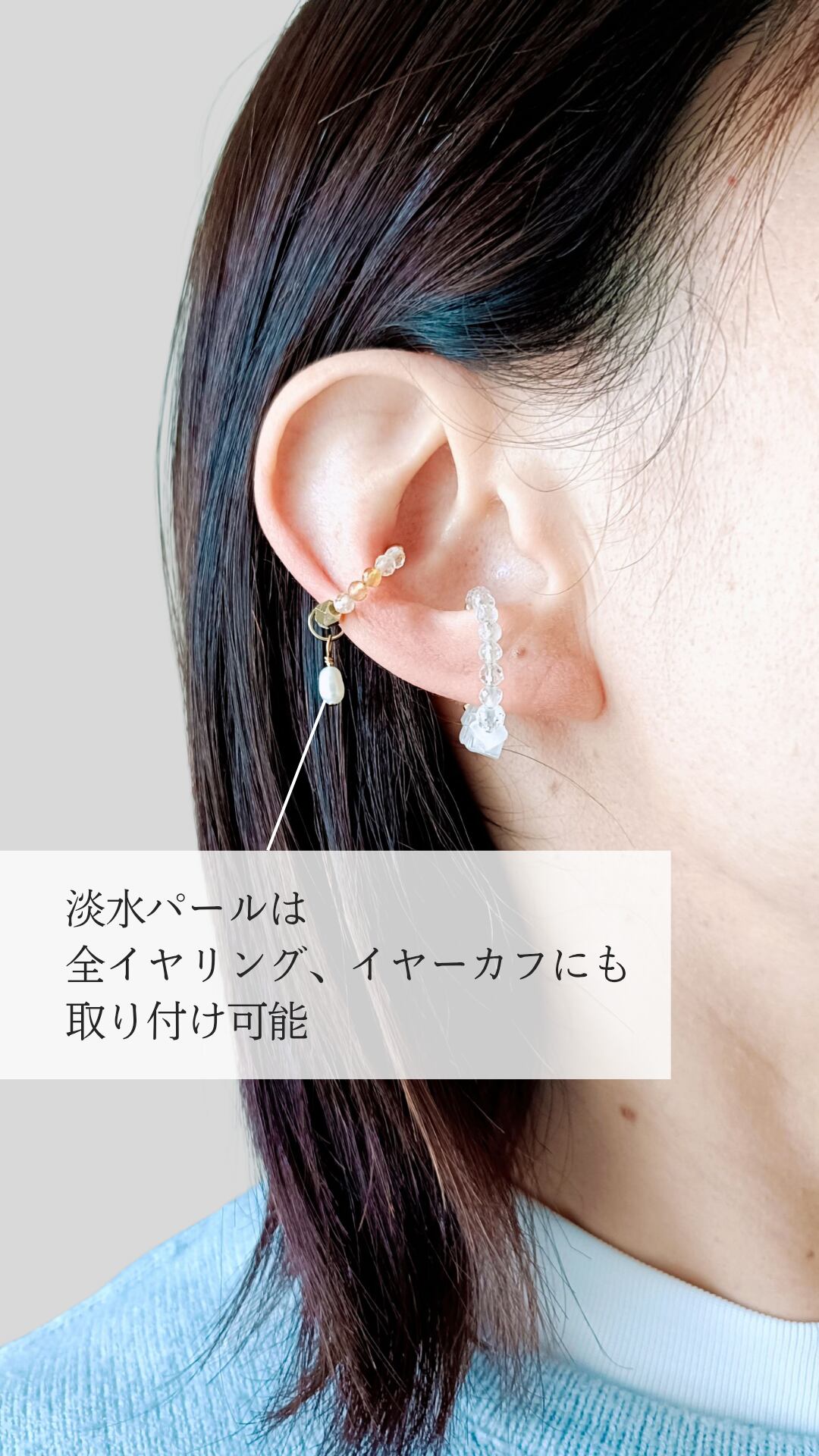 つるんとした淡水パールのチャームは、他のイヤリングやイヤーカフとも組み合わせ可能*