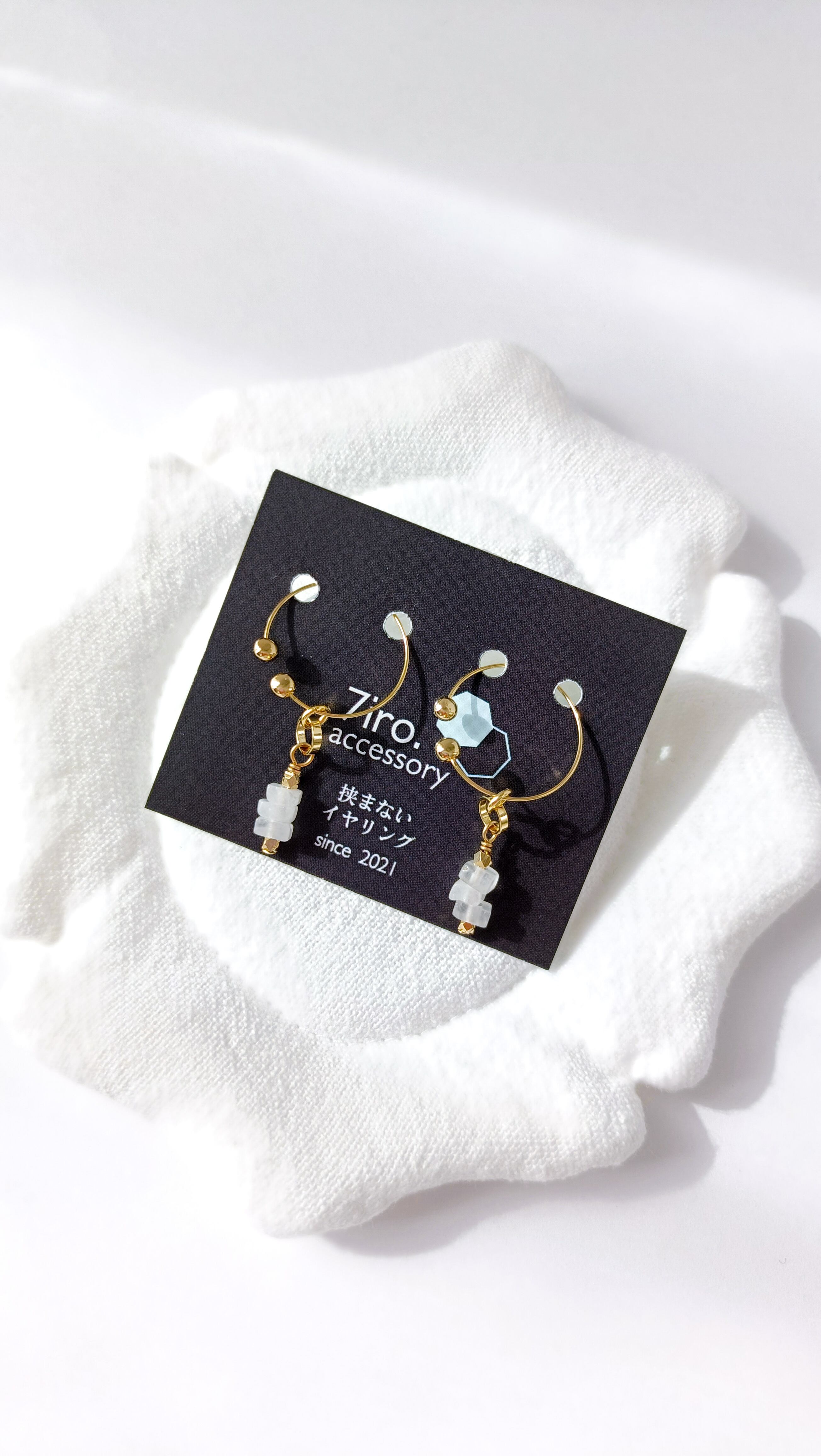 金具の玉の間隔を、広げたり狭めたり、微調整ができる形状記憶タイプなので、着ける方の耳の厚みに合わせて頂く事ができます。