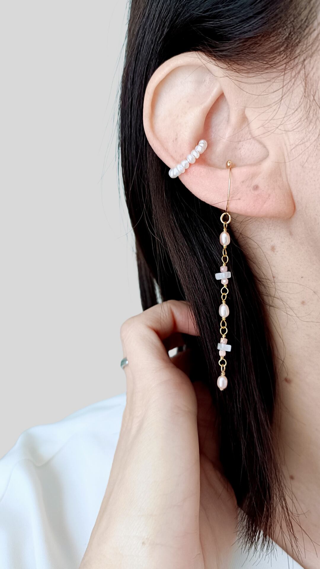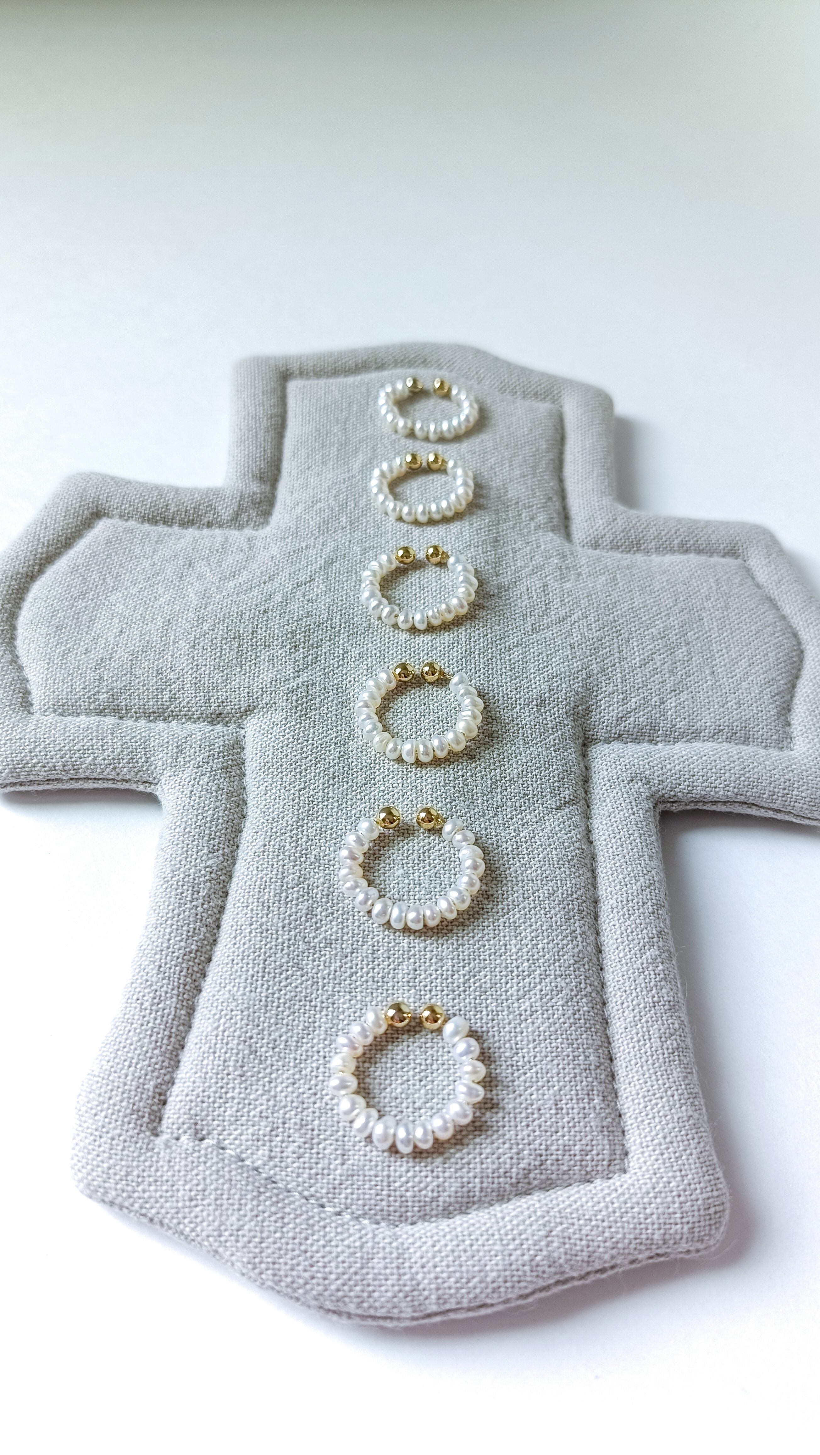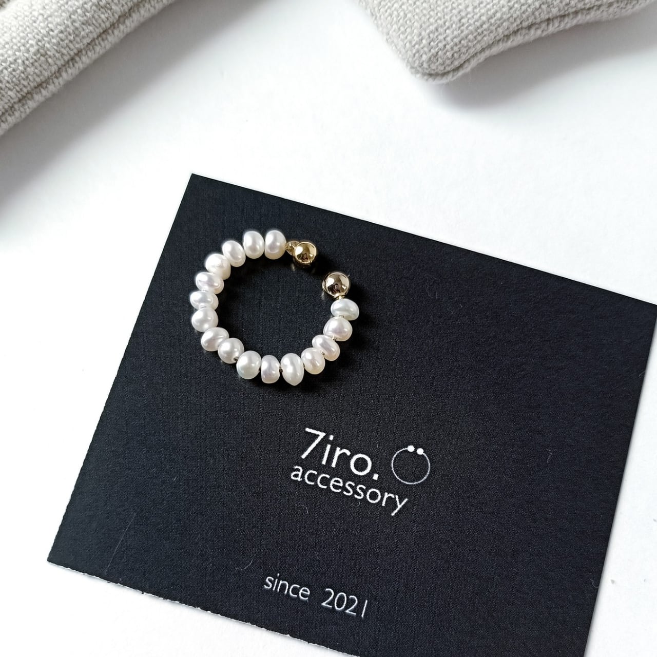 当店で販売しているイヤリング同様、金具の玉の間隔を、広げたり狭めたり、微調整ができる形状記憶タイプなので、着ける方の耳の厚みに合わせて頂く事ができます。