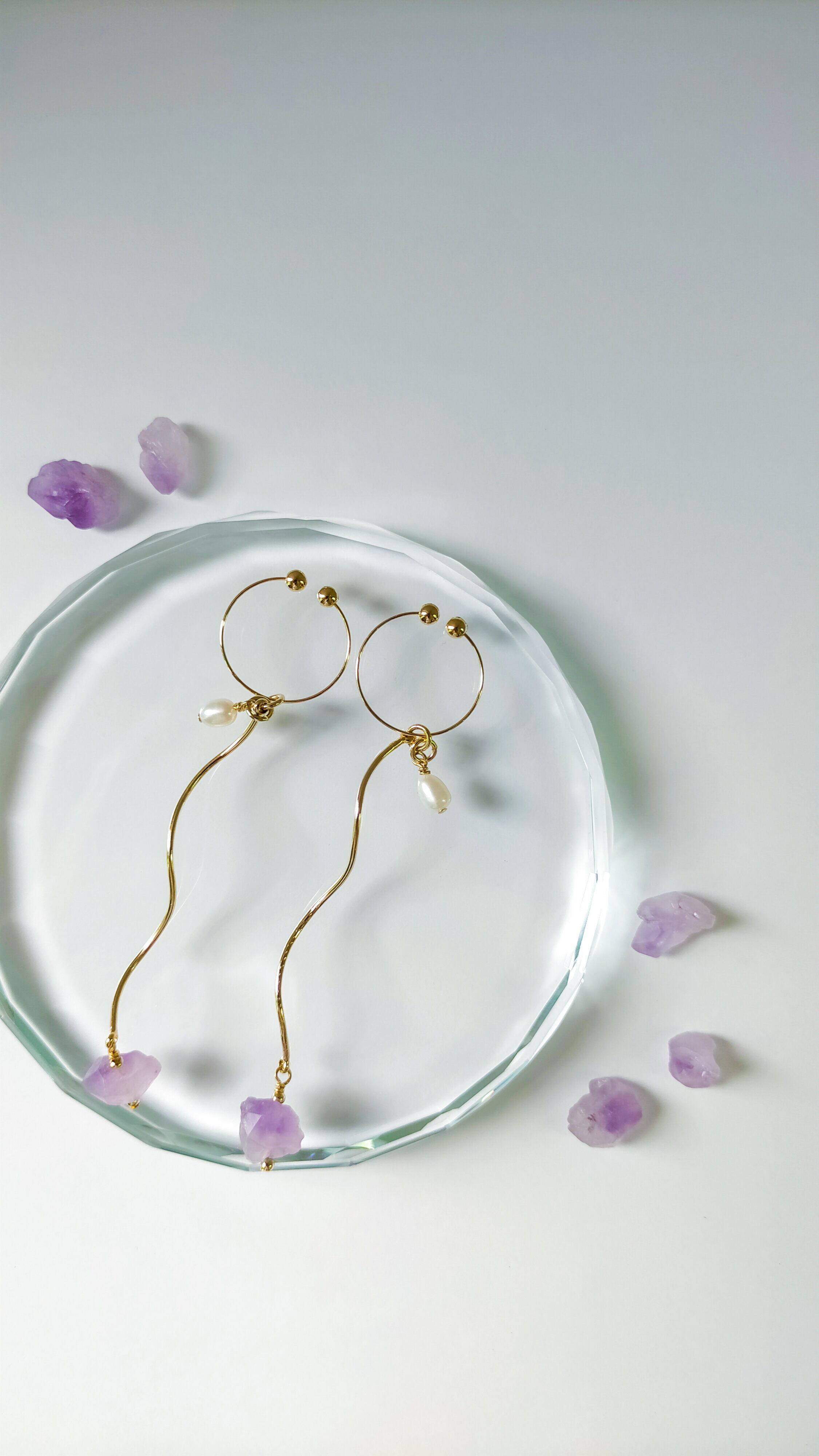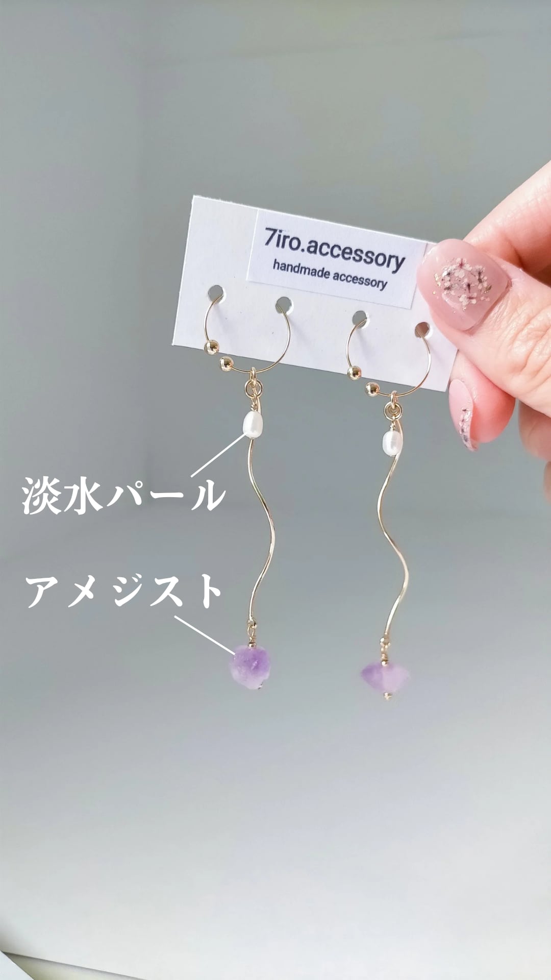 2月の誕生石でもある、淡い紫のアメジストと、そこに、艶やかな小粒の淡水パールを添えました
