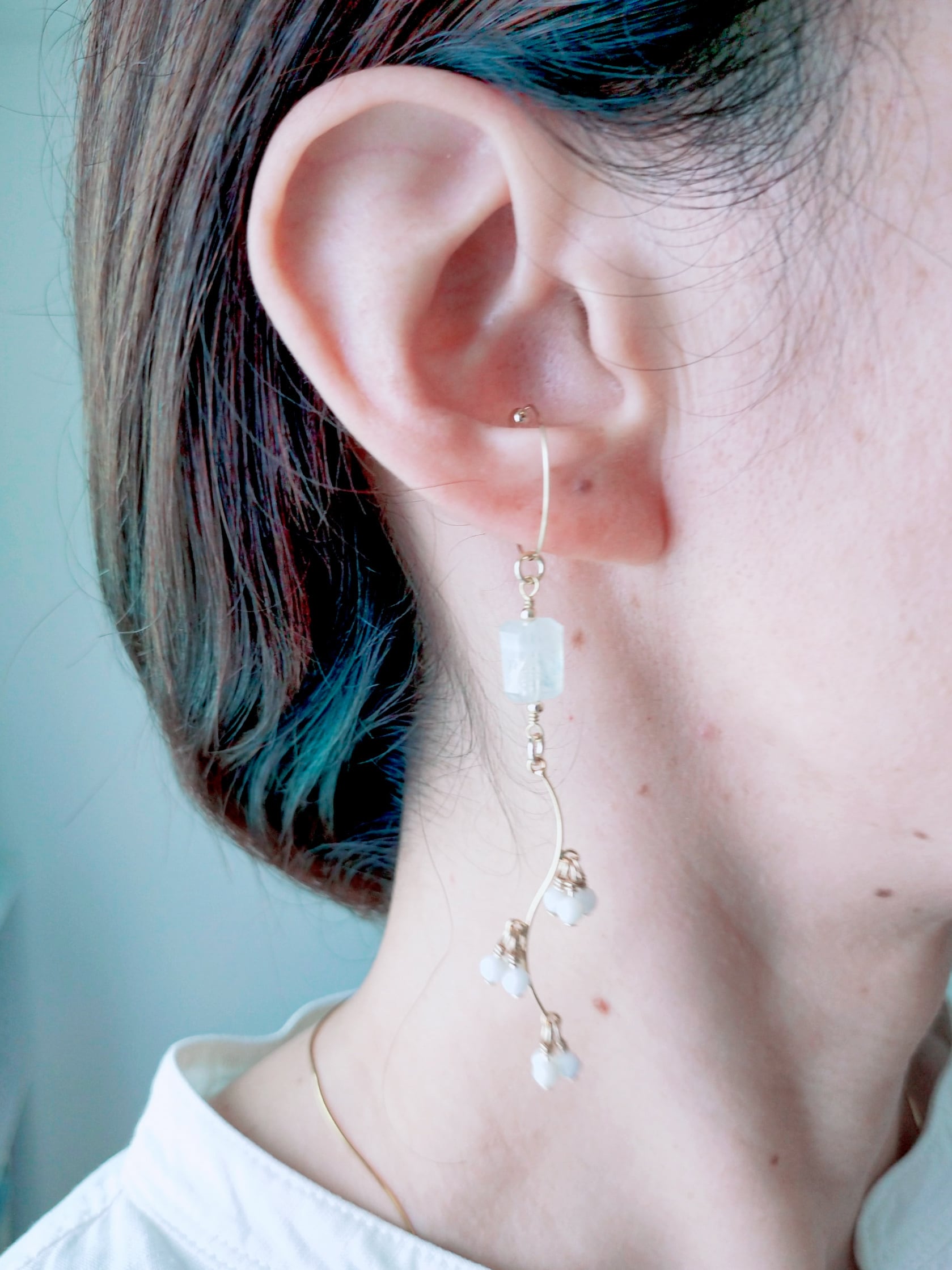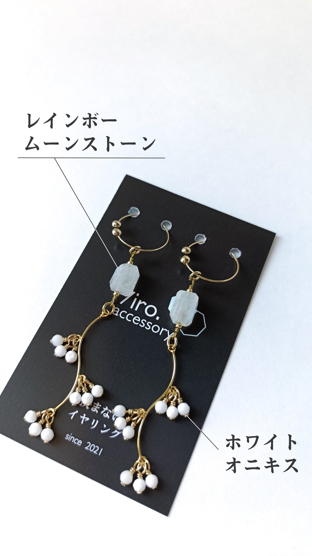 このイヤリングの1番の魅力は、「レインボー ムーンストーン」という、虹の光が見られる、幻想的な天然石が使われている事