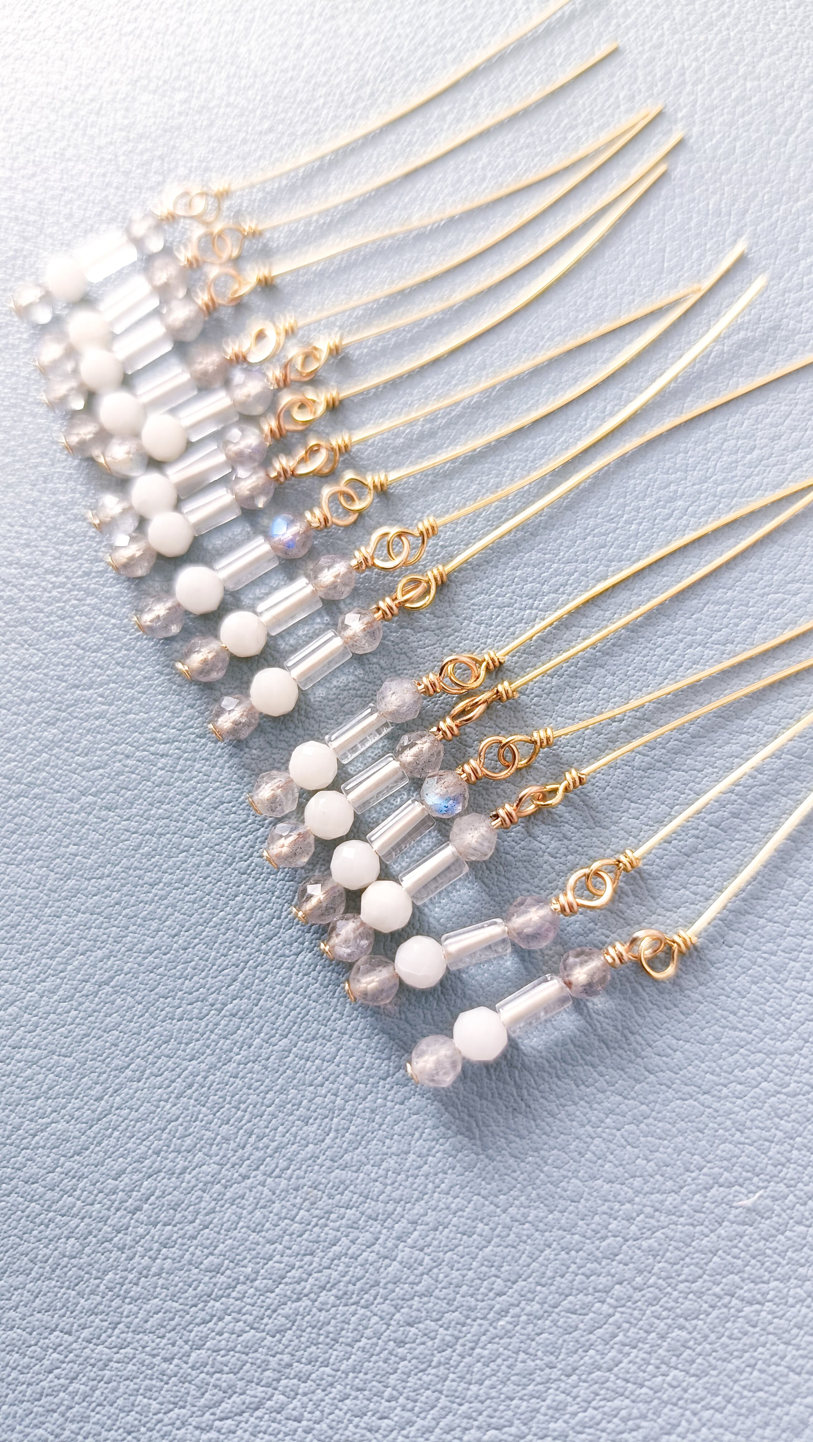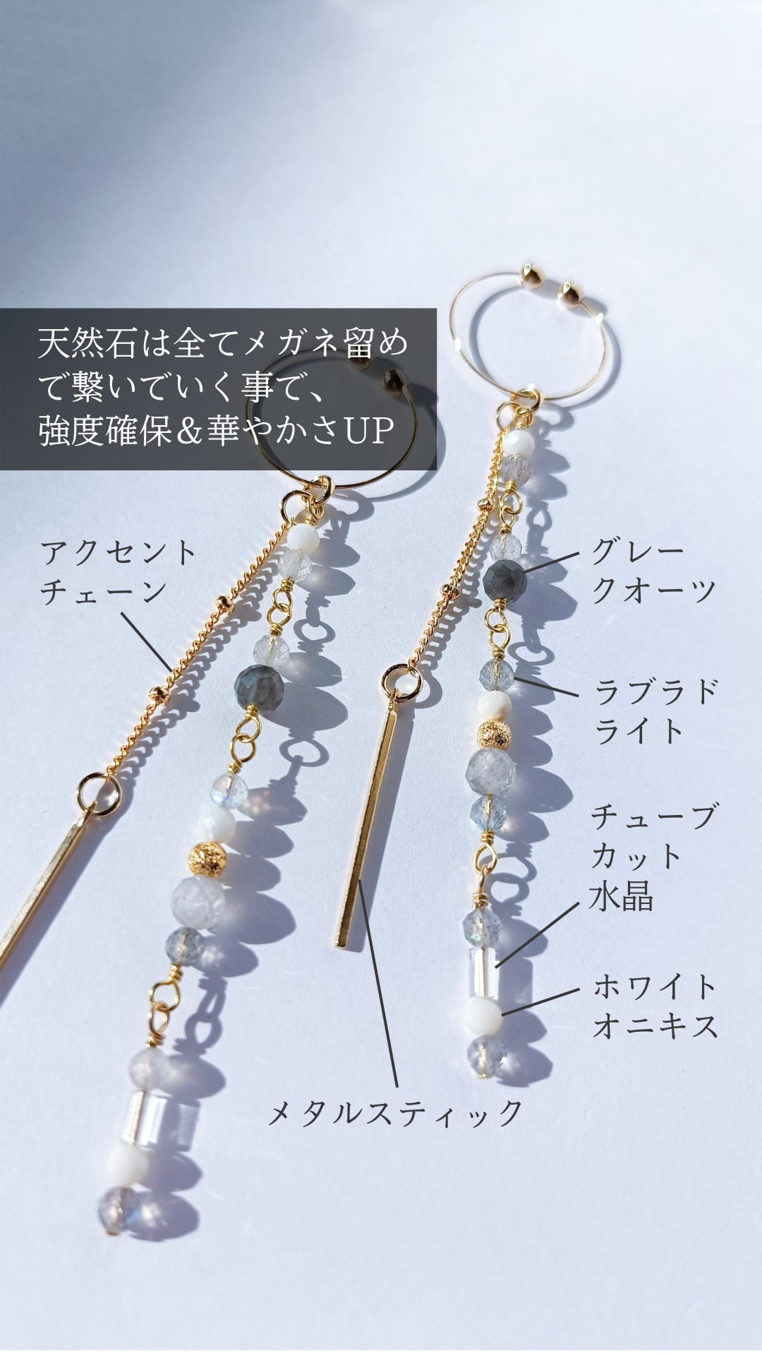 1つ1つ、「メガネ留め」という技法で、強度にもこだわり尽くしたイヤリング、グレーカラーの煌めきを楽しんでくださいね♪